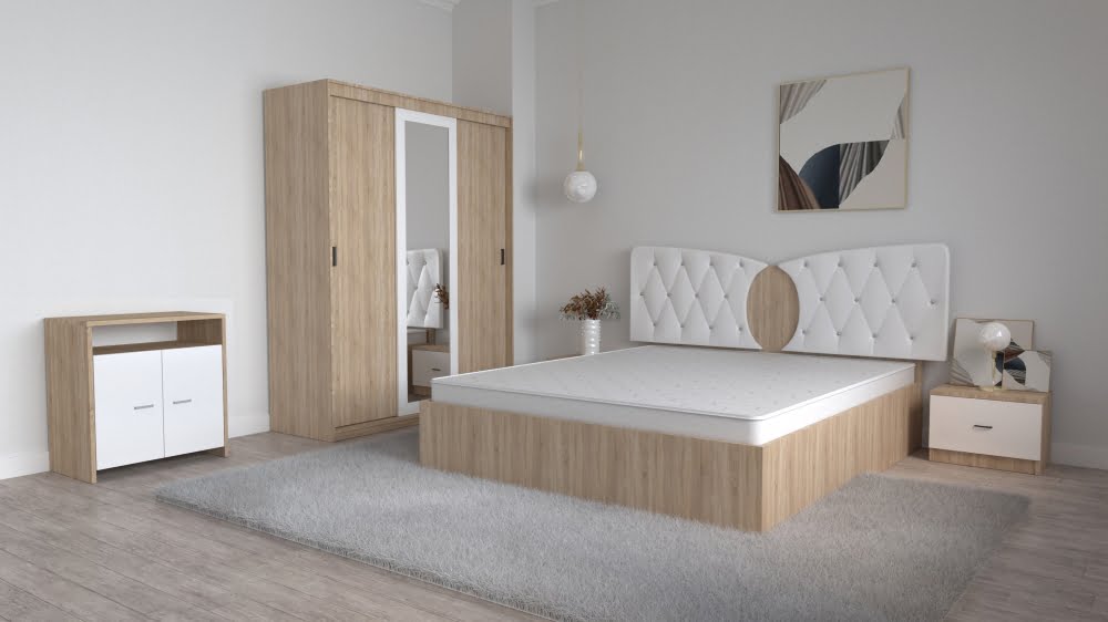 Dormitorul Kent Sonoma Alb cu Pat Matrimonial de 160 cm x 200 cm, Dulap cu 3 usi Glisante cu Oglinda, Noptiere si Comoda Tv Lorena.