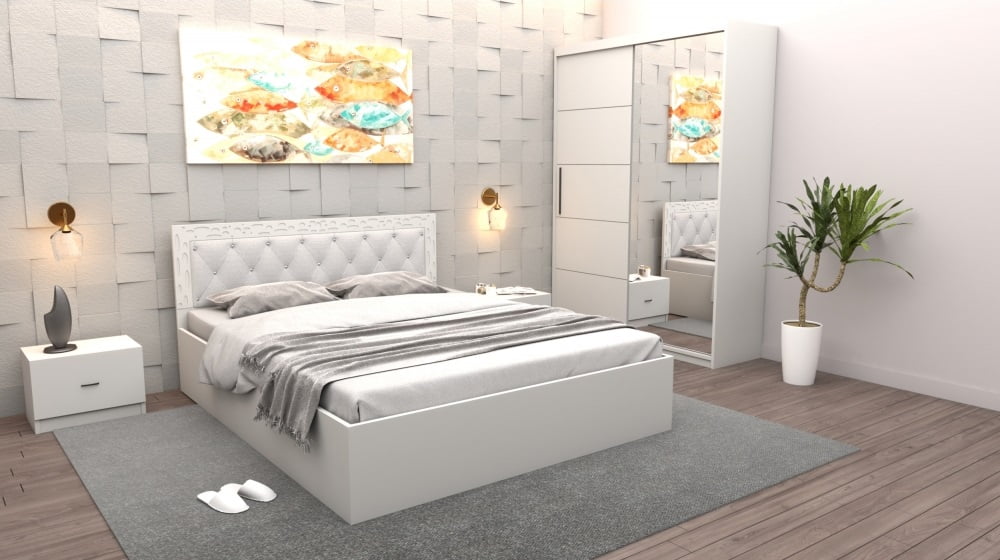 Dormitorul Maia alb este o combinație perfectă între design modern și funcționalitate. Patul tapitat alb, cu o lățime de 160 cm, emană eleganță și confort, fiind completat de un dressing practic, dotat cu oglindă. Dormitorul este conceput pentru a maximiza spațiul, cu un design curat și minimalist. Patul și dressing-ul se completează reciproc, creând un aspect armonios și stilat. În plus, culorile albe ale dormitorului Maia conferă o senzație de liniște și relaxare, făcându-l potrivit pentru un somn odihnitor și o atmosferă plăcută în cameră.