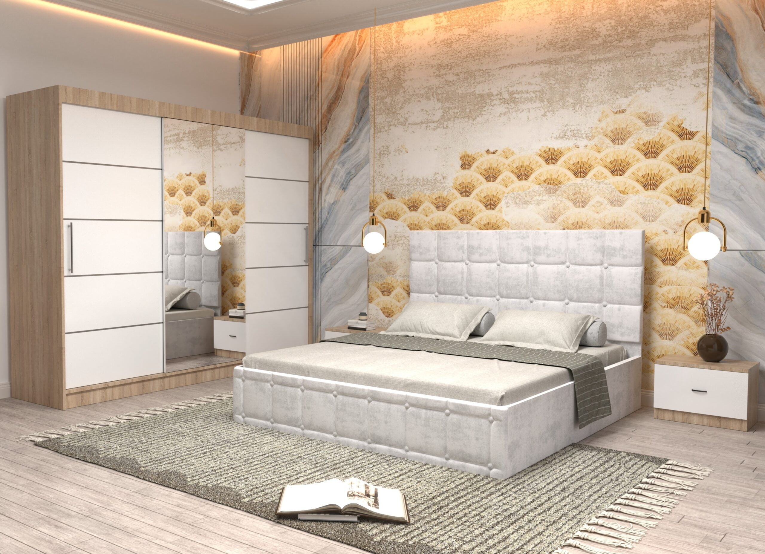 Dormitor Regal cu Pat Matrimonial Alb Stofa Dulap usi glisante 250 x 200 cm Sonoma cu usi glisante Albe Cu Oglinda si Noptiere