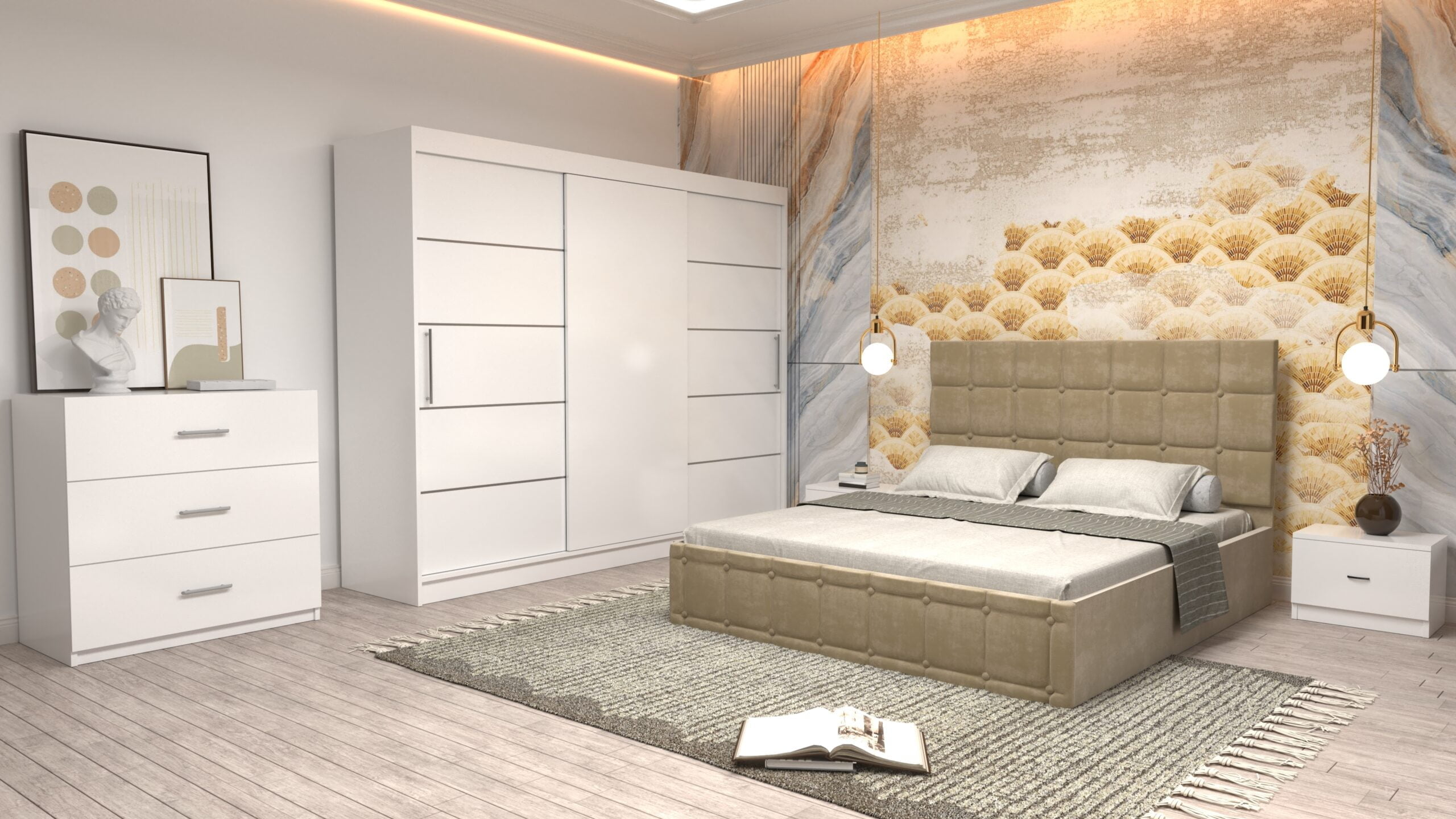 Dormitor Regal cu Pat Matrimonial Bej Stofa Dulap usi glisante 250 x 200 cm Alb cu usi Albe Fara Oglinda Noptiere si comoda TV