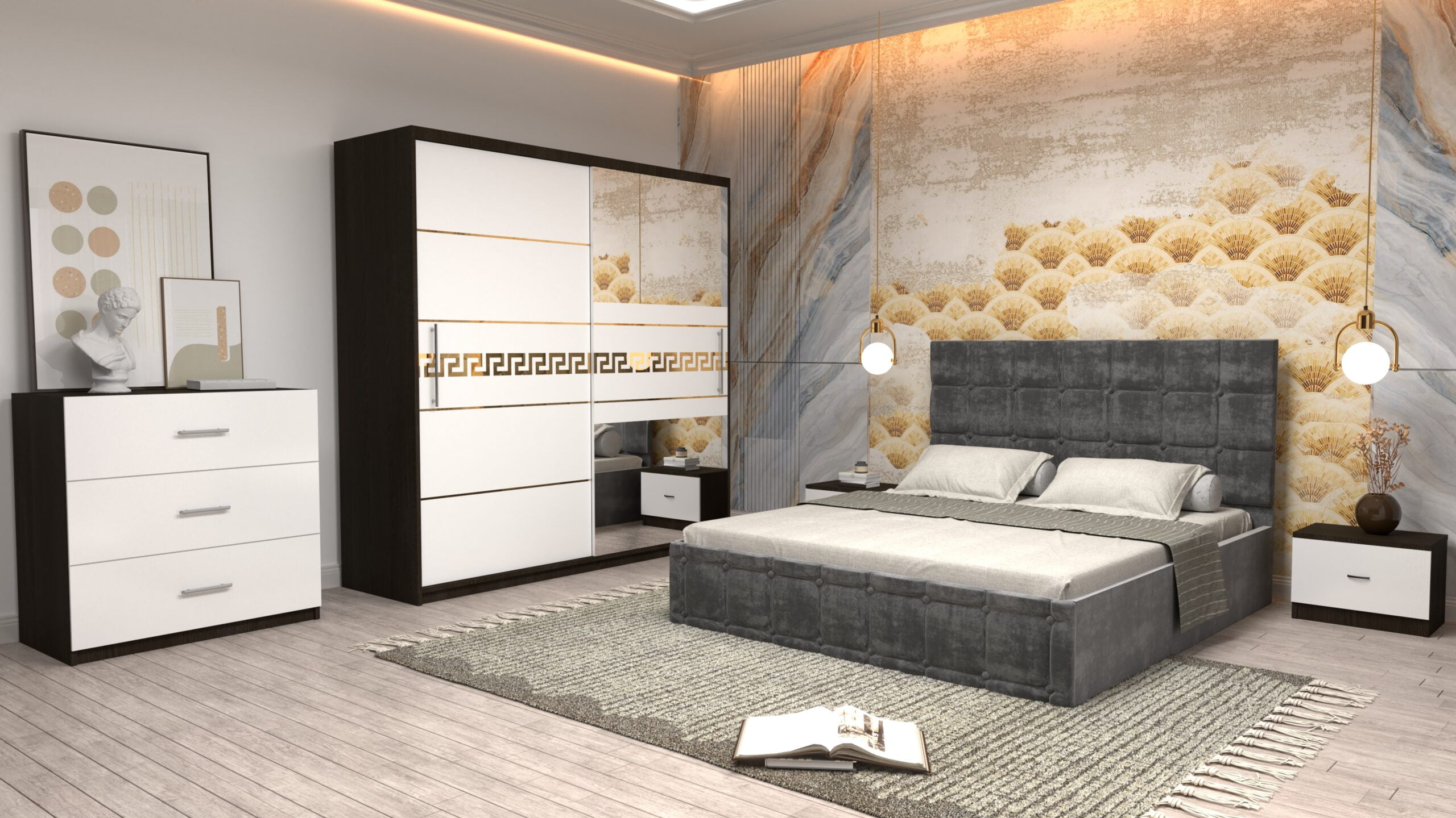 Dormitor Regal cu Pat Matrimonial Gri Stofa Dulap Gold usi glisante 200 x 200 cm Wenghe cu usi Albe Cu Oglinda Noptiere si comoda TV