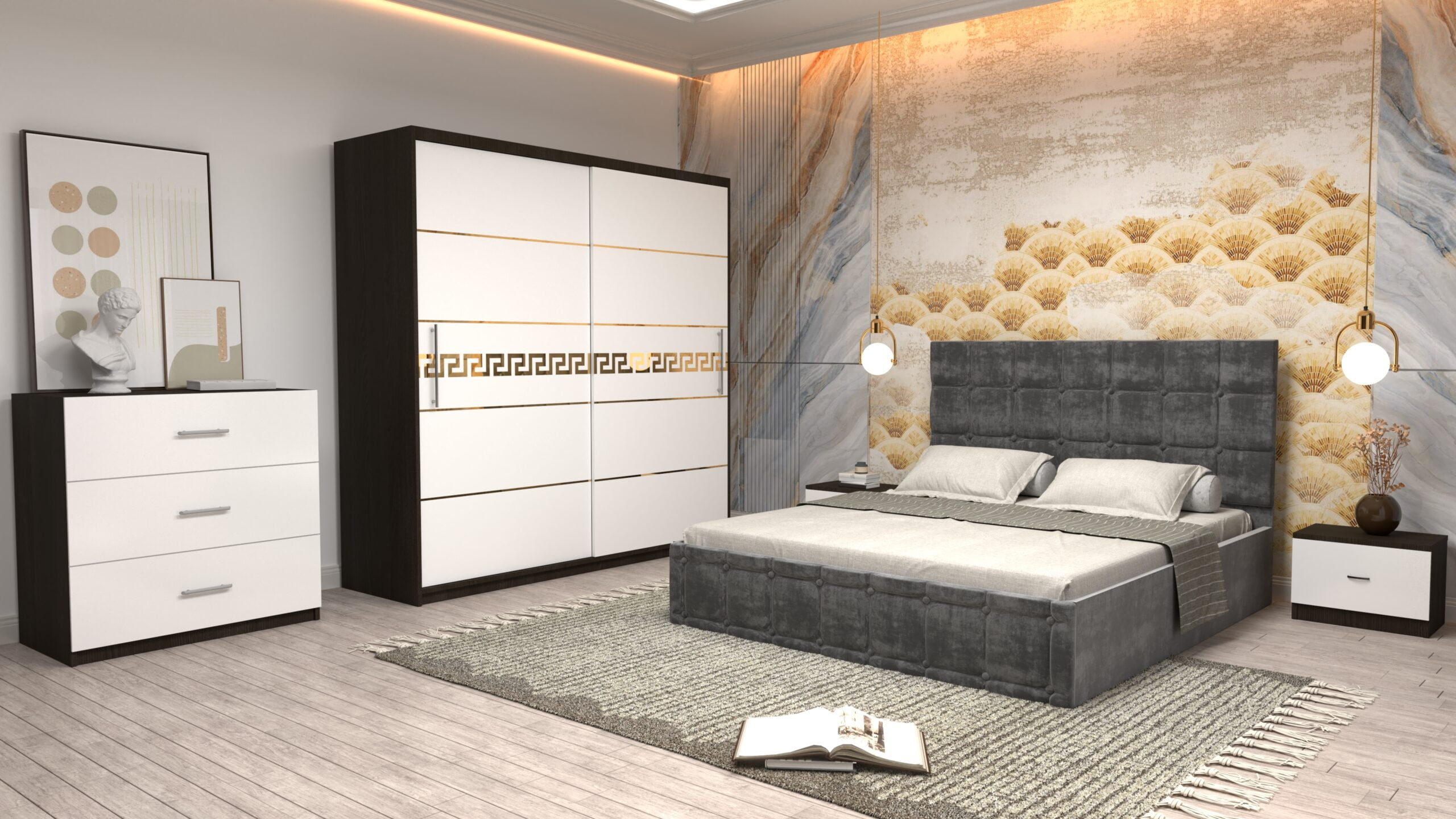 Dormitor Regal cu Pat Matrimonial Gri Stofa Dulap Gold usi glisante 200 x 200 cm Wenghe cu usi Albe Fara Oglinda Noptiere si comoda TV