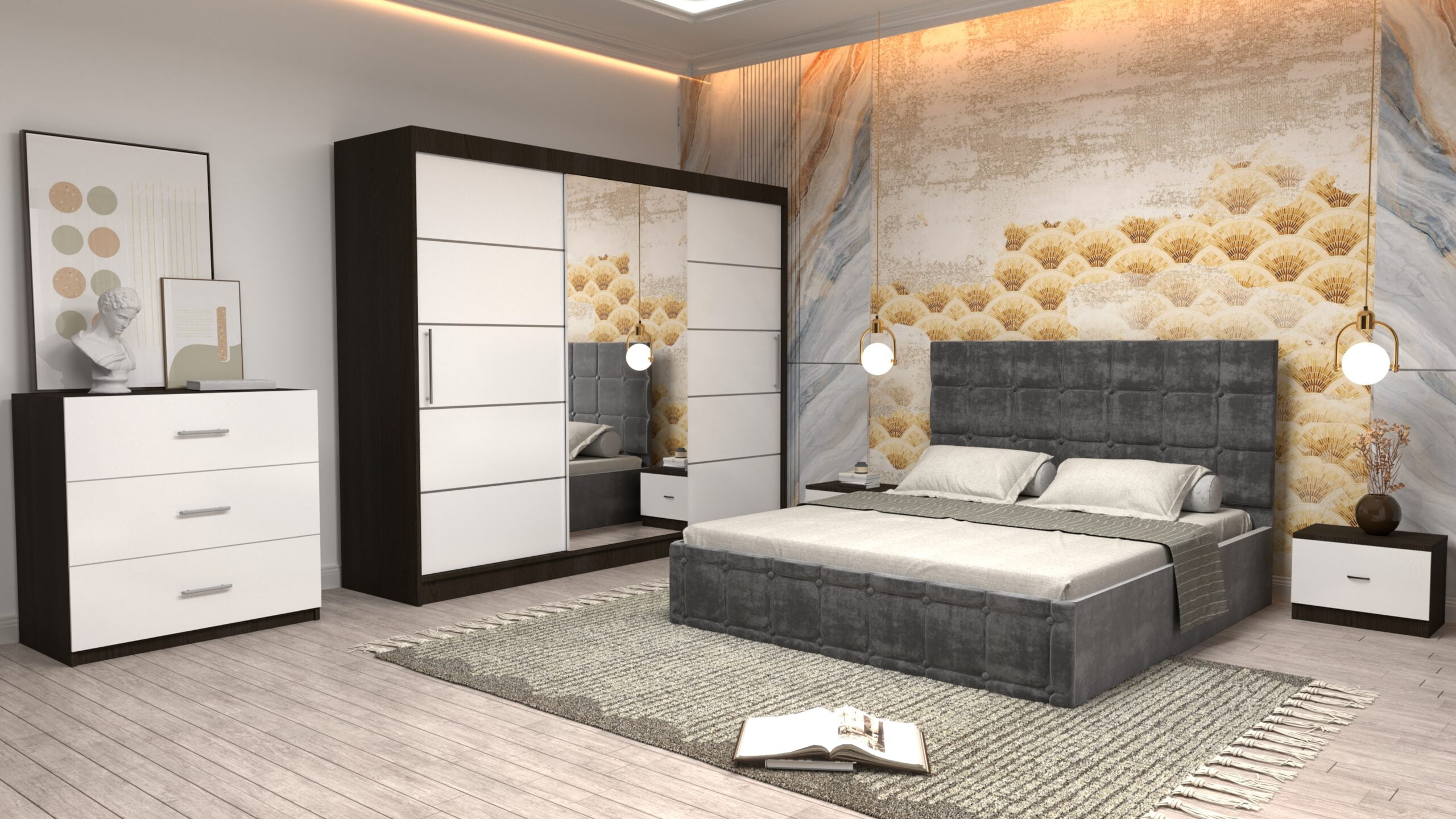 Dormitor Regal cu Pat Matrimonial Gri Stofa Dulap usi glisante 250 x 200 cm Wenghe cu usi Albe Cu Oglinda Noptiere si comoda TV