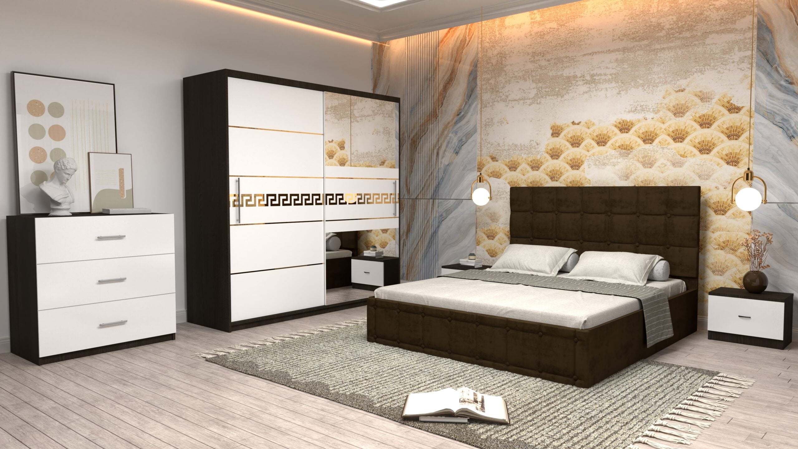 Dormitor Regal cu Pat Matrimonial Maro Stofa Dulap Gold usi glisante 200 x 200 cm Wenghe cu usi Albe Cu Oglinda Noptiere si comoda TV