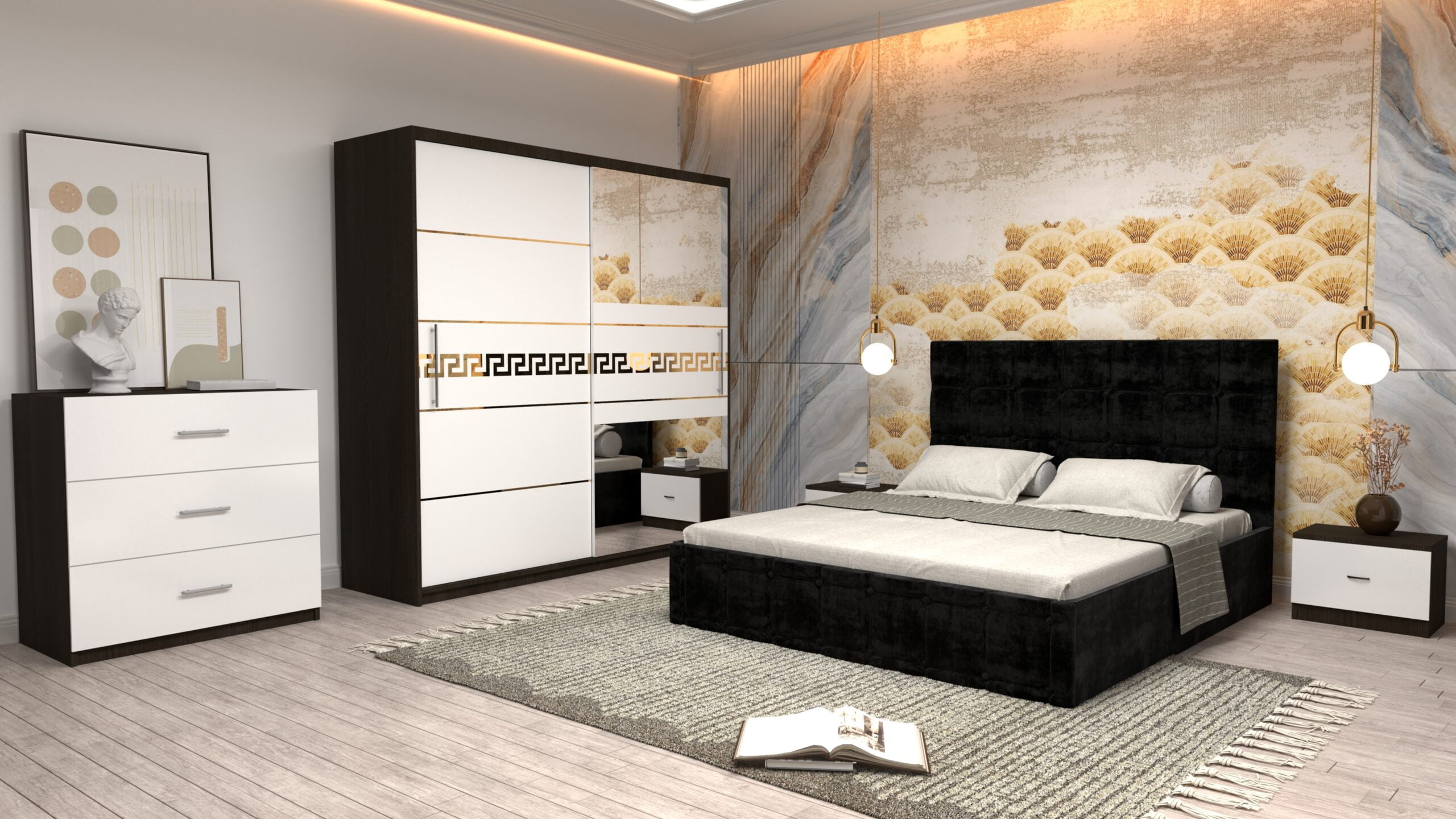 Dormitor Regal cu Pat Matrimonial Negru Stofa Dulap Gold usi glisante 200 x 200 cm Wenghe cu usi Albe Cu Oglinda Noptiere si comoda TV