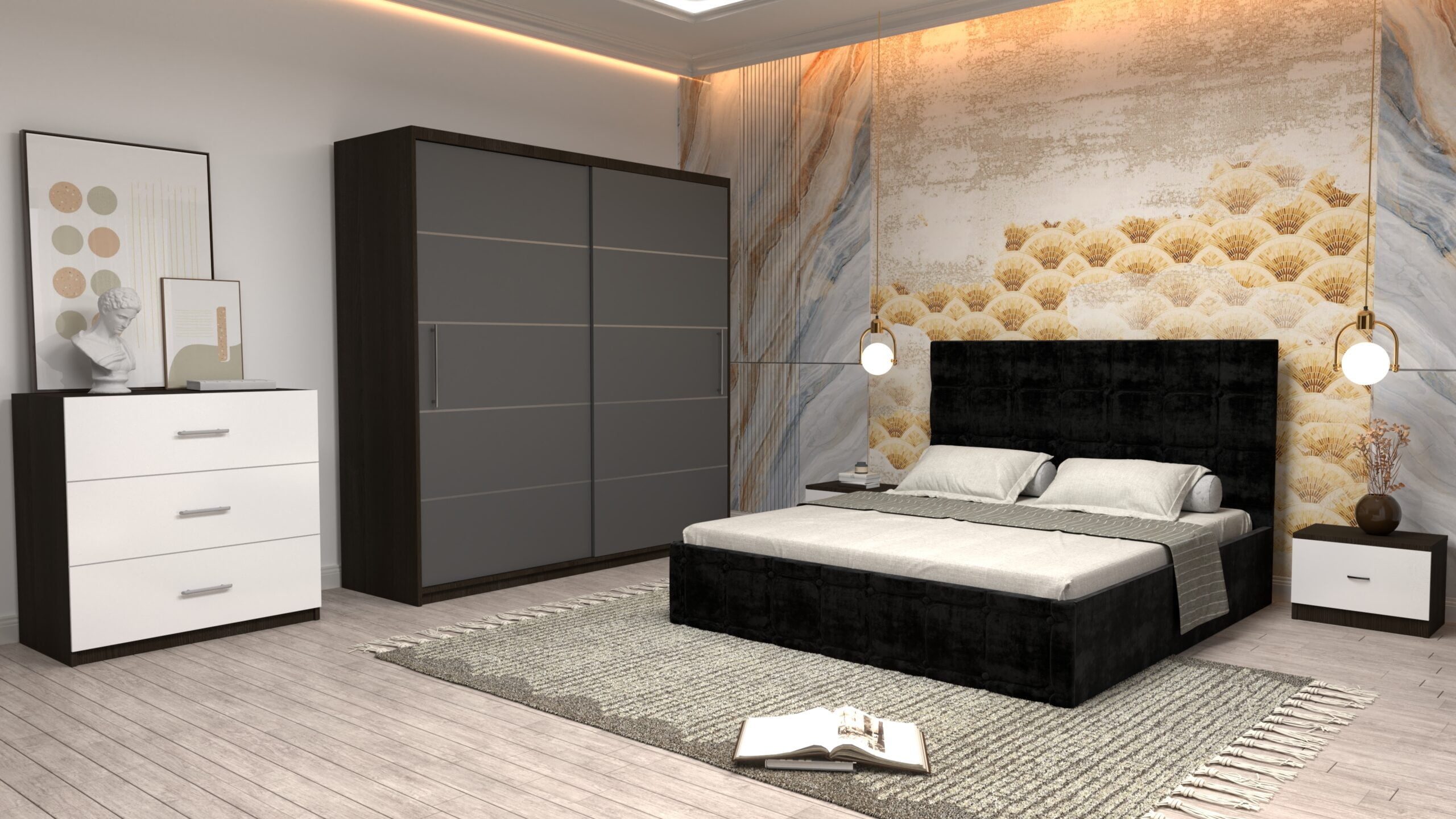 Dormitor Regal cu Pat Matrimonial Negru Stofa Dulap usi glisante 200 x 200 cm Wenghe cu usi Gri Fara Oglinda Noptiere si comoda TV