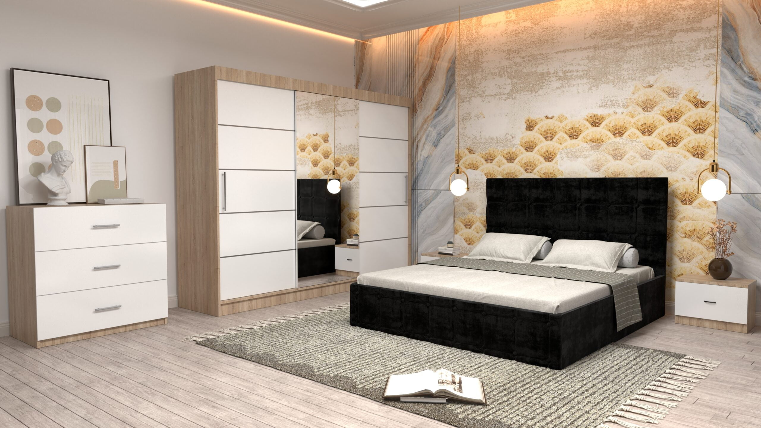 Dormitor Regal cu Pat Matrimonial Negru Stofa Dulap usi glisante 250 x 200 cm Sonoma cu usi Albe Cu Oglinda Noptiere si comoda TV