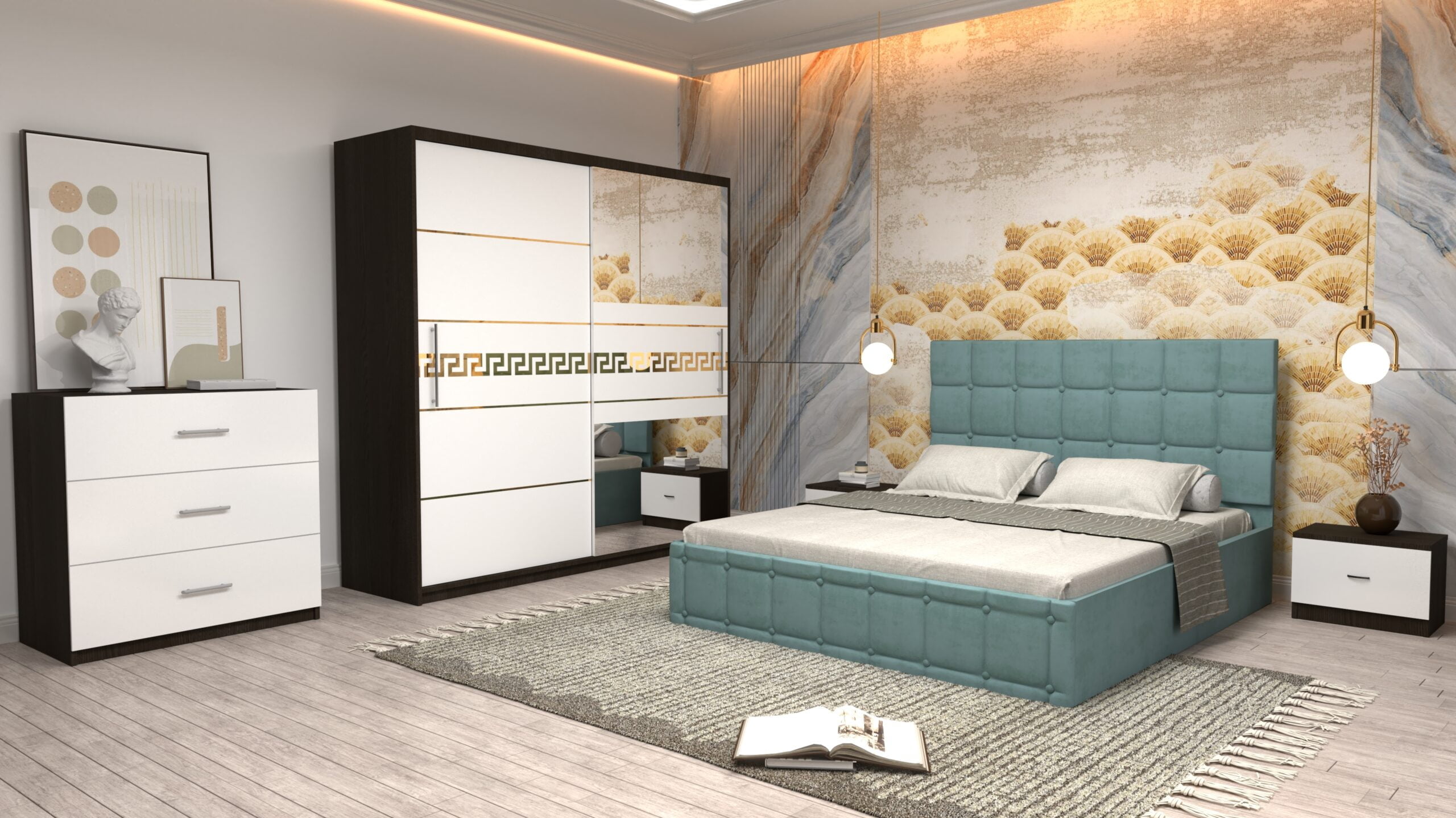 Dormitor Regal cu Pat Matrimonial Turcoaz Stofa Dulap Gold usi glisante 200 x 200 cm Wenghe cu usi Albe Cu Oglinda Noptiere si comoda TV
