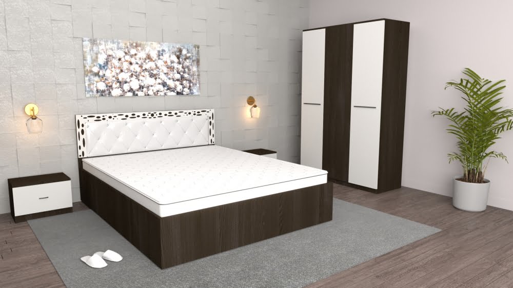 Dormitorul Royal Wenge cu Dulapul 3 usi Wenge, Patul Matrimonial Wenge si Noptierele Wenge ofera un design modern si elegant. Acesta este realizat din lemn masiv de calitate superioara si are un finisaj wenge.