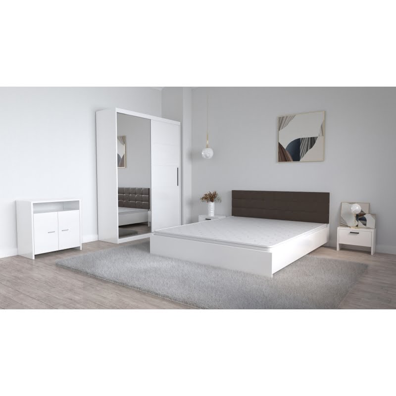 Set Dormitor Coral Alb cu tablie tapitata Magia Dressing 2 usi glisante cu oglinda Noptiere si Comoda TV Lorena
