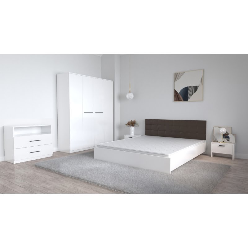 Set Dormitor Coral Alb cu tablie tapitata Wenghe Dulap Lorena 4 usi Noptiere si Comoda TV Royal