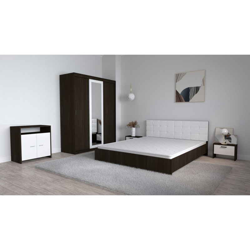 Set Dormitor Coral Wenghe cu tablie tapitata Alba Dressing 3 usi glisante cu oglinda Noptiere si Comoda TV Lorena