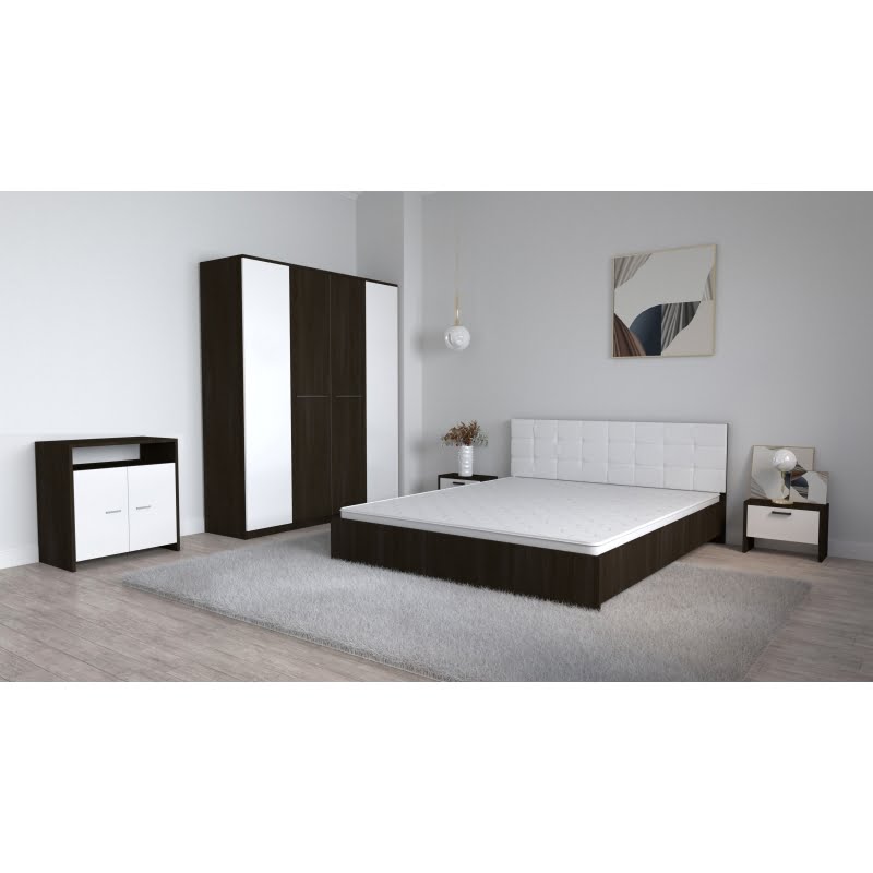 Set Dormitor Coral Wenghe cu tablie tapitata Alba Dulap Lorena 4 usi Noptiere si Comoda TV Lorena