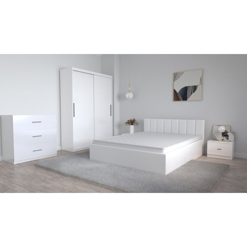 Set Dormitor, Pat Tapitat, Piele Ecologica, Dressing, Usi Fara Oglinda, Noptiere, Comoda TV, Sertare – Tip produs: Set Dormitor; Culoare: Alb; Pat Tapitat: Piele Ecologica; Dressing: 2 Usi Fara Oglinda; Noptiere: Da; Comoda TV: Da; Sertare: 3.