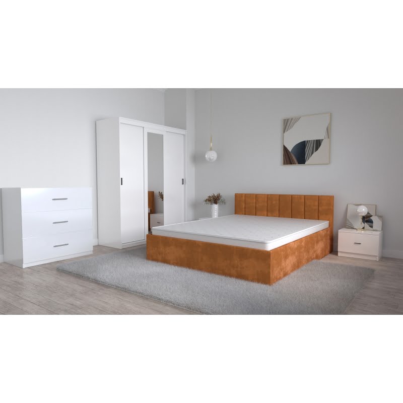 Set Dormitor Oliver Alb cu pat tapitat Caramiziu Dressing 3 usi glisante cu oglinda Noptiere si Comoda TV 3 sertare – Setul de dormitor Oliver Alb cu pat tapitat în culoarea Caramiziu, dressing cu 3 uși glisante cu oglindă, noptiere și comodă TV cu 3 sertare.