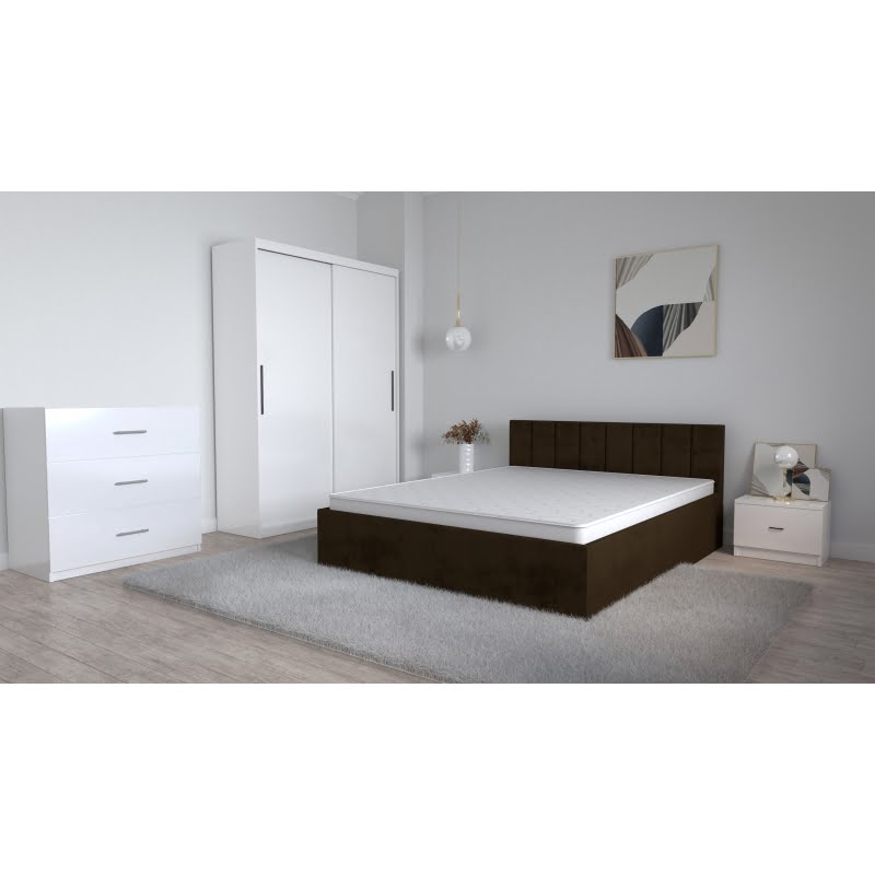 Set dormitor Oliver Alb, pat tapitat maro închis, dressing 2 usi glisante, oglinda, noptiere, comoda TV 3 sertare – Set dormitor Oliver Alb, pat tapitat maro închis, dressing cu 2 uși glisante, fără oglindă, noptiere, comodă TV cu 3 sertare.